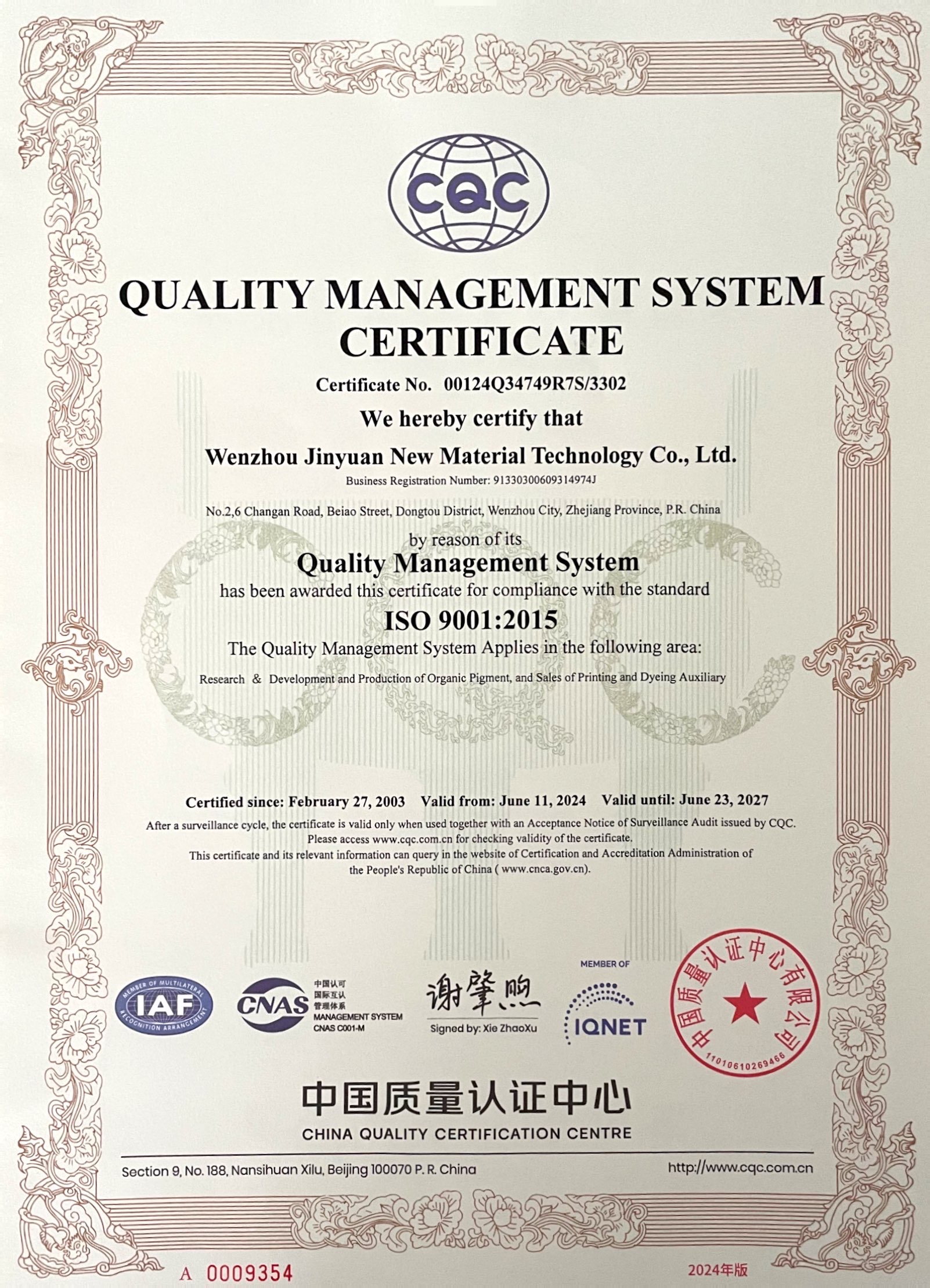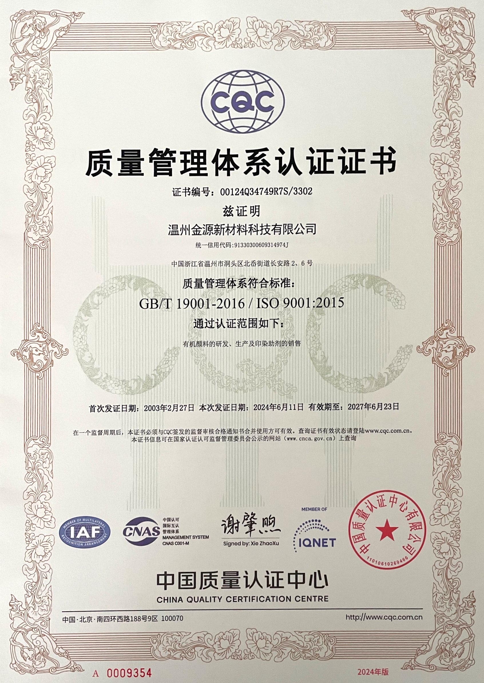 質量管理體系認證證書