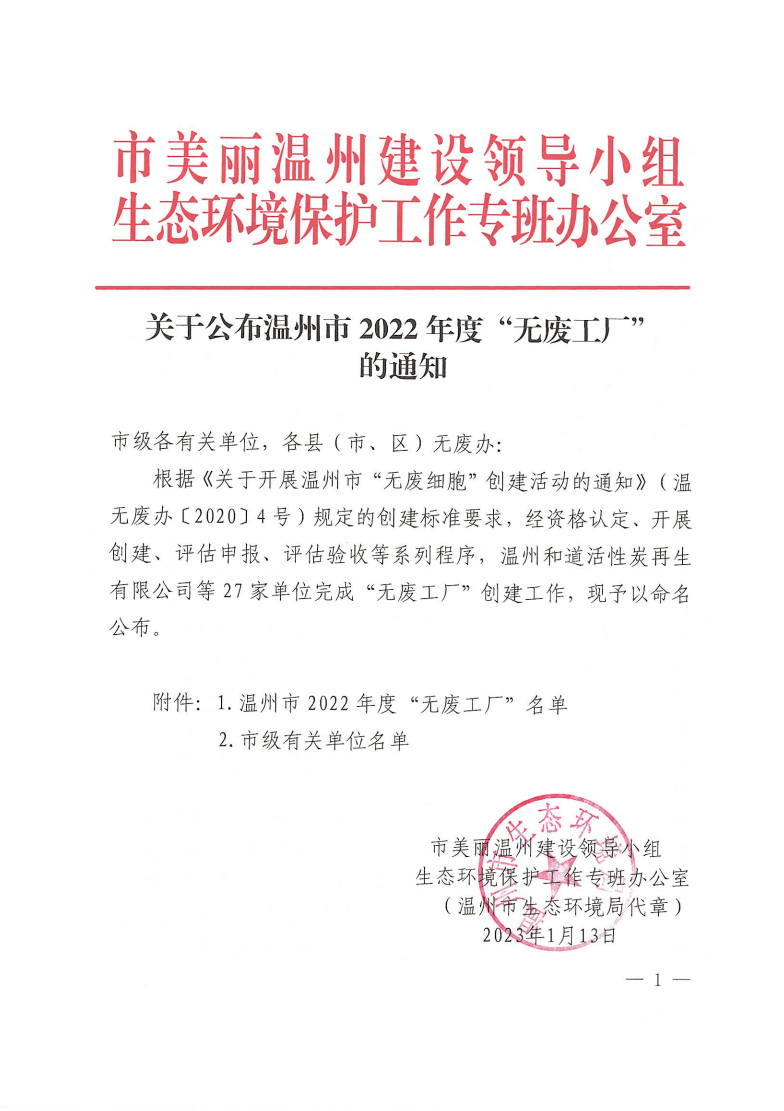 關(guān)于公布溫州市2022年度“無廢工廠”的通知
